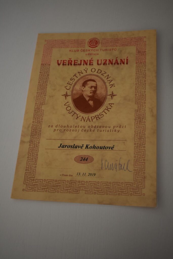 Při slavnostním setkání na radnici obdržela Jaroslava Kohoutová za dlouholetou obětavou práci pro rozvoj české turistiky ocenění I. stupně – Čestný odznak Vojty Náprstka. Toto ocenění nikdo v Havlíčkově Brodě nemá. Starosta a místostarostové předali dárky. Jubilantka napsala do Kroniky Města Havlíčkův Brod motto o životě: „Dokud žiješ – choď, dokud chodíš – žiješ!“