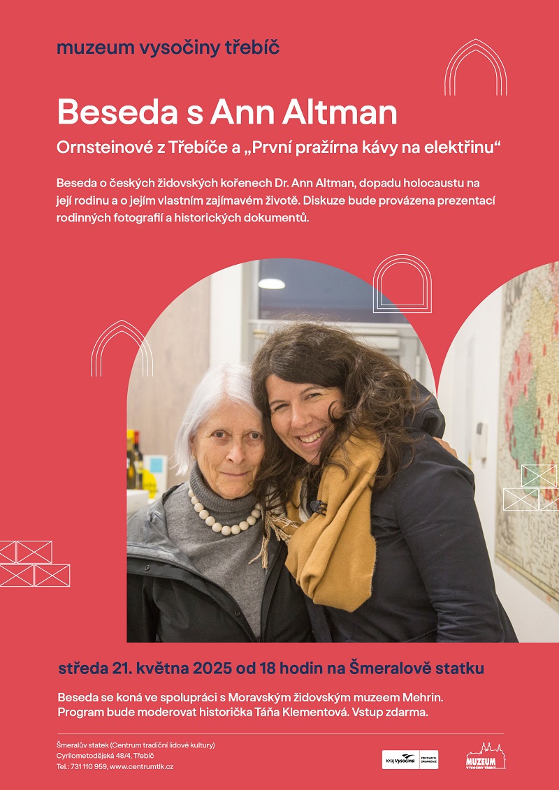 O týden později za námi přijede Dr. Ann Altman a bude vyprávět o Ornsteinových z Třebíče, První pražírně kávy na elektřinu, svých českých židovských kořenech a o dopadu holocaustu na rodinu Ornsteinových. Začátek je v 18.00 a vstupy na obě akce jsou zdarma.