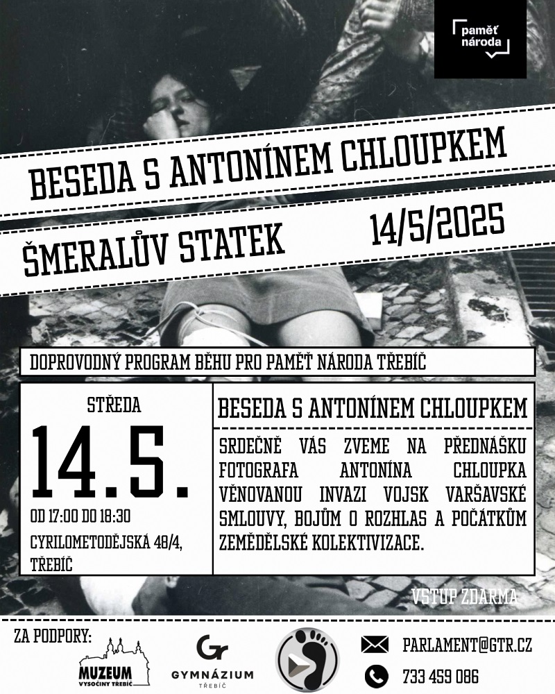 V rámci doprovodného programu Běhu pro Paměť národa se ve středu 14. května uskuteční beseda s fotografem Antonínem Chloupkem věnovaná invazi vojsk Varšavské smlouvy, bojům o rozhlas a počátkům zemědělská kolektivizace. Začátek je v 17.00.