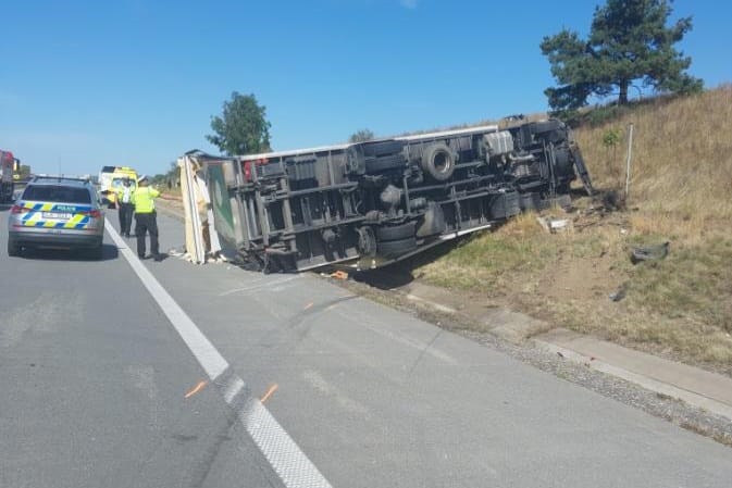 Před jednou hodinou odpoledne se za asistence policejní hlídky se podařilo s havarovaným autobusem se všemi cestujícími přejet na dálniční odpočívku na 145. Kilometr ve směru na Prahu. Nákladní vozidlo vyprošťovala specializovaná odtahová služba.