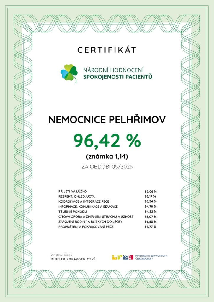 Nemocnice Pelhřimov tak opět potvrdila své silné postavení mezi zdravotnickými zařízeními a výsledky ukazují, že dlouhodobě poskytuje péči, se kterou jsou pacienti spokojeni.