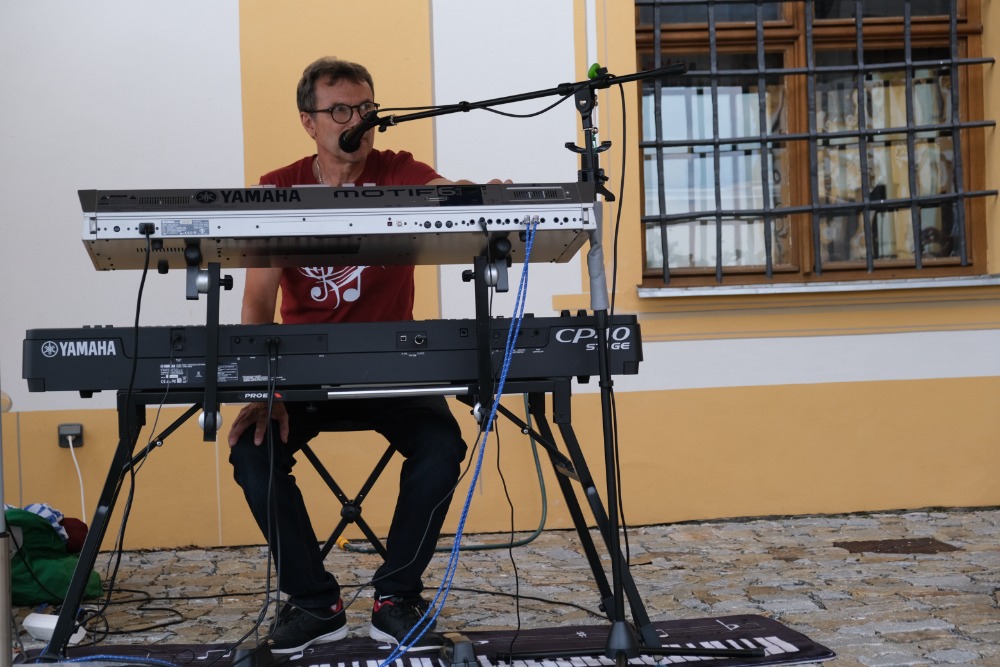 V rámci letních hudebních večerů na terase jaroměřického kostela se uskutečnilo v sobotu 26. července večer hudební představení hudebníka Petra Vobůrky z Moravských Budějovic, který zahrál skladby své i známé a populární hity.