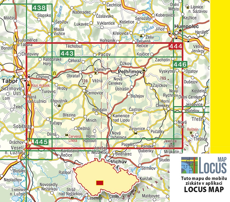 Oblast Pelhřimovska je zakreslena v turistické mapě s číslem 444. Představuje region s nesčetnými možnostmi pěších i cykloturistických výletů nejen pro objevování přírodních krás, ale také kulturního dědictví. Pěšky či na kole s výběrem z mnoha cyklostezek si turisté s novou mapou pohodlněji naplánují výlety do brány Vysočiny, historického města Pelhřimov, na poutní místo Křemešník s rozhlednou, do Horní Cerekve, Počátků a dalších míst a obcí.