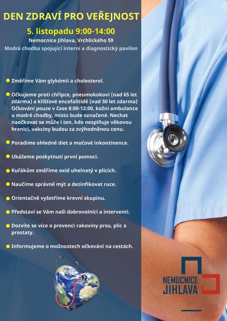 Den zdraví pro veřejnost se koná v jihlavské nemocnici v modré chodbě spojující interní a diagnostický pavilon v úterý 5. listopadu mezi 9.00 a14.00.