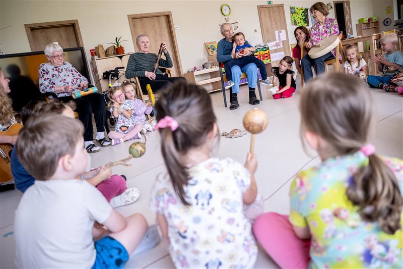 Děti z Mateřské školy Sluníčko čeká s babičkami a dědečky muzikoterapie s Eliškou Křížkovou. „Můžu si sednout dědovi na klín?“ ptá se tmavovlasý klouček vedoucí pedagožky Moniky Vaškové a usmívá se při tom na dědu Jardu, který se usadil na židli. „To víš, že můžeš,“ odpovídá mu pohotově pan Jaroslav a bere si ho na klín.