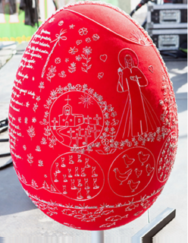 „Obří 60 cm vysoká kraslice zdobená 481 velikonočními objekty ze stříbrného drátu je dílem Draga Vujoviče z Černé Hory. Červené vajíčko je ozdobené šesti drátem psanými koledami, obrazy Krista, beránkem, hospodou a kostelem se hřbitovem. Dále je zde vyobrazeno v kruzích i mimo ně na 481 postav či předmětů (271 květů, 66 ryb, 14 jezevčíků, 7 sov, 8 stromů, 21 koček, 6 slepic, 32 andělů, 13 králíků, 10 koní, 1 historické vysoké kolo, 2 běžná kola, 9 křížů, 2 dogy, 6 srdíček, 1 pomlázka, 3 slunce, 8 motýlů, 1 labuť). Rekordmanovi práce na neobvyklém velikonočním symbolu, který bude zapsán do České knihy rekordů, trvala 6 týdnů po 4–5 hodinách denně,“ popisuje Miroslav Marek, prezident Agentury Dobrý den Pelhřimov. Kraslice bude vystavena v Muzeu rekordů v pelhřimovské Dolní bráně.
