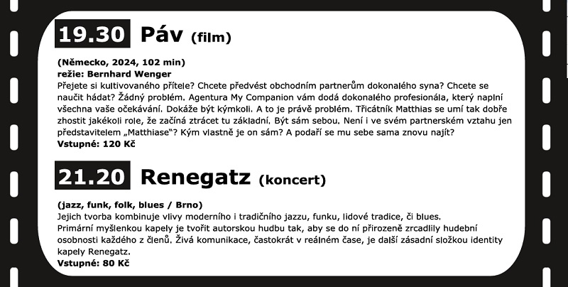 Filmový klub Přibyslav připravil na sobotu 22. března projekci filmu Páv, kterou doplní koncert brněnské kapely Renegatz, kombinující vlivy moderního i tradičního jazzu.