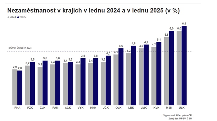 Podle informací Úřadu práce ČR vzrostl meziměsíčně podíl nezaměstnaných osob kromě hlavního města Prahy ve všech krajích. V absolutní hodnotě přibylo v lednu 2025 proti prosinci 2024 nejvíce uchazečů o zaměstnání v Jihočeském, Jihomoravském a Moravskoslezském kraji. Co se týká meziročního srovnání, tak podíl nezaměstnaných se proti lednu 2024 nejvíce zvýšil v kraji Libereckém (o 0,6 procentního bodu), dále ve Zlínském, na Vysočině a v Moravskoslezském kraji (shodně o 0,5 procentního bodu). Meziroční pokles podílu nezaměstnaných zaznamenal jediný kraj, Praha, v ostatních třinácti krajích eviduje Úřad práce ČR meziroční nárůst.
