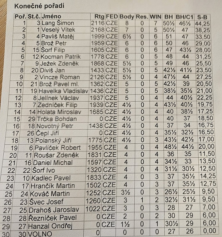 Vítěz Šimon Lang z ŠK Světlá nad Sázavou vybojoval osm bodů a potvrdil, že je velkým šachovým talentem. Na druhém místě skončil hlavní organizátor a nejlepší šachista ŠK Jiskra Havlíčkův Brod Vítek Veselý a na třetím další talent šachu Matěj Pavliš z Havlíčkova Brodu.