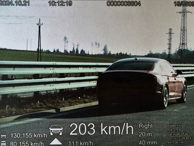 V pondělí dopoledne hlídka dálničního oddělení Velký Beranov kontrolovala se služebním vozem Škoda Superb dodržování dovolených rychlostních limitů a změřila překročení nejvyšší dovolené rychlosti vozu Audi s českou registrační značkou, které řídil dvaačtyřicetiletý muž. „Vozu krátce po desáté hodině dopoledne naměřili na 117,5 kilometru dálnice ve směru na Brno radarovým zařízením rychlost 203 kilometru v hodině, když nejvyšší dovolená rychlost v uvedeném místě je stanovena na 130 kilometrů v hodině,“ uvedla Dana Čírtková, tisková mluvčí krajských policistů na Vysočině.