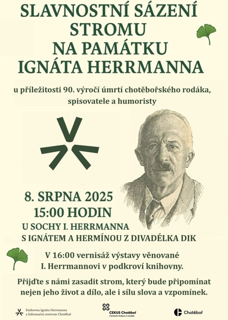 Chotěbořská knihovna pořádá v pátek 8. srpna slavnostní zasazení stromu u pomníku Ignáta Herrmanna, které bude pokračovat vernisáží tematické výstavy v podkroví knihovny.