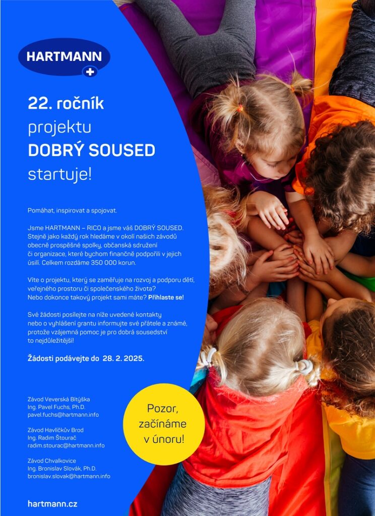 Celkem pět set tisíc korun rozdá v letošním roce společnost HARTMANN – RICO obecně prospěšným spolkům, občanským sdružením či organizacím působícím v okolí závodů ve Veverské Bítýšce, Chvalkovicích a Havlíčkově Brodě. Projekt Dobrý soused se letos koná již po dvaadvacáté a firma už jeho prostřednictvím rozdala pět milionů korun. Žádosti o podporu lze podávat do konce února.