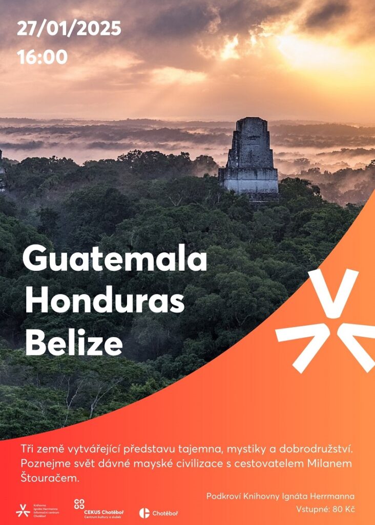 Guatemalu označili slavní cestovatelé Hanzelka a Zikmund za nejkrásnější zemi na světě. V pondělí si účastníci besedy v Chotěboři představí její bývalé hlavní město Antiguu, velkolepý archeologický areál v Tikalu, podnikneme výlet po řece Rio Dulce. V Hondurasu se nachází archeologické naleziště mayské civilizace Copán. Belize je plná přírodních krás a pyšní se nejvyšším vodopádem ve střední Americe nebo jedinou jaguáří rezervací na světě.