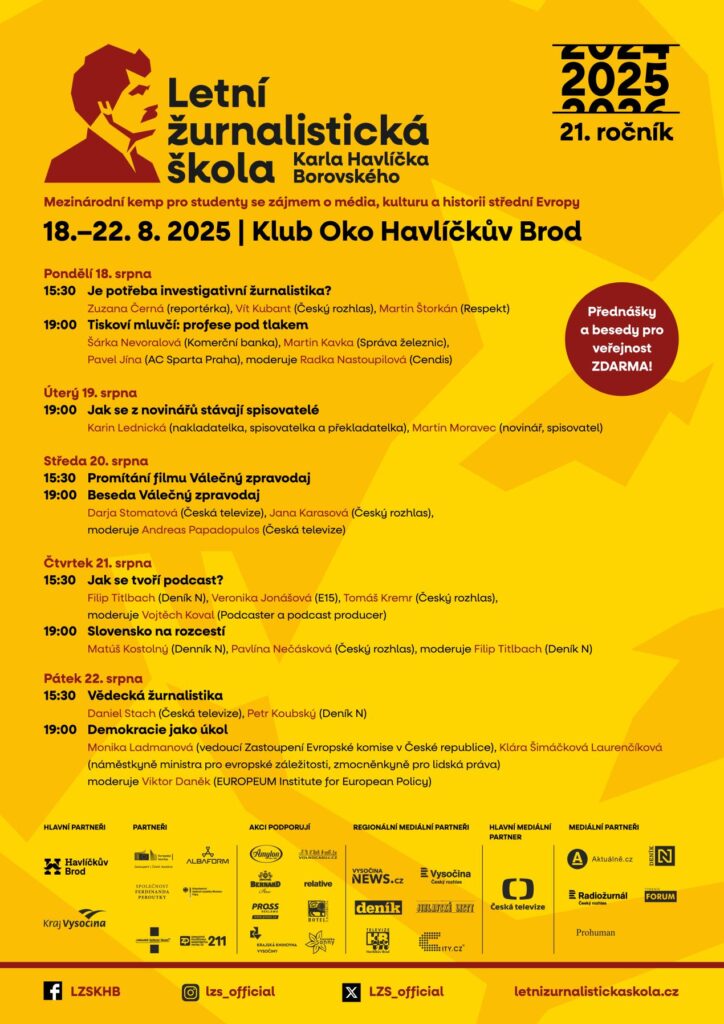 V programu otevřeném veřejnosti zdarma se pak setkají v debatách s aktuálními tématy, která hýbou nejen světem médií,“ popsala Monika Brothánková, ředitelka Letní žurnalistické školy Karla Havlíčka Borovského. Jednadvacátého ročníku letní školy se účastní na pět desítek mladých lidí z Česka, Slovenska a Ukrajiny.