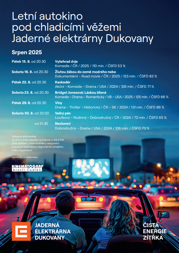 Pravou letní filmovou pohodu si mohou návštěvníci užít od 15. do 30. srpna, vždy v pátek a v sobotu v jedinečné atmosféře pravého autokina přímo u jaderné elektrárny. Dukovanské autokino se pyšní největší pevnou projekční plochou pod širým nebem o velikosti 16,4 x 7 metrů s kapacitou několika set aut. Promítání tak neohrozí žádný rozmar letního počasí.