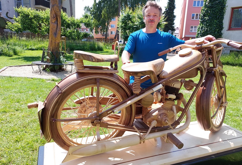 Mistr truhlář Pavel Svoboda z Horní Cerekve prokázal opakovaně svou neuvěřitelnou zručnost. Premiérově dnes v zahradě Muzea rekordů v Pelhřimově představil svůj světově unikátní model motocyklu ČZ 250 Sport z roku 1938, který dokončil po tříletém úsilí.